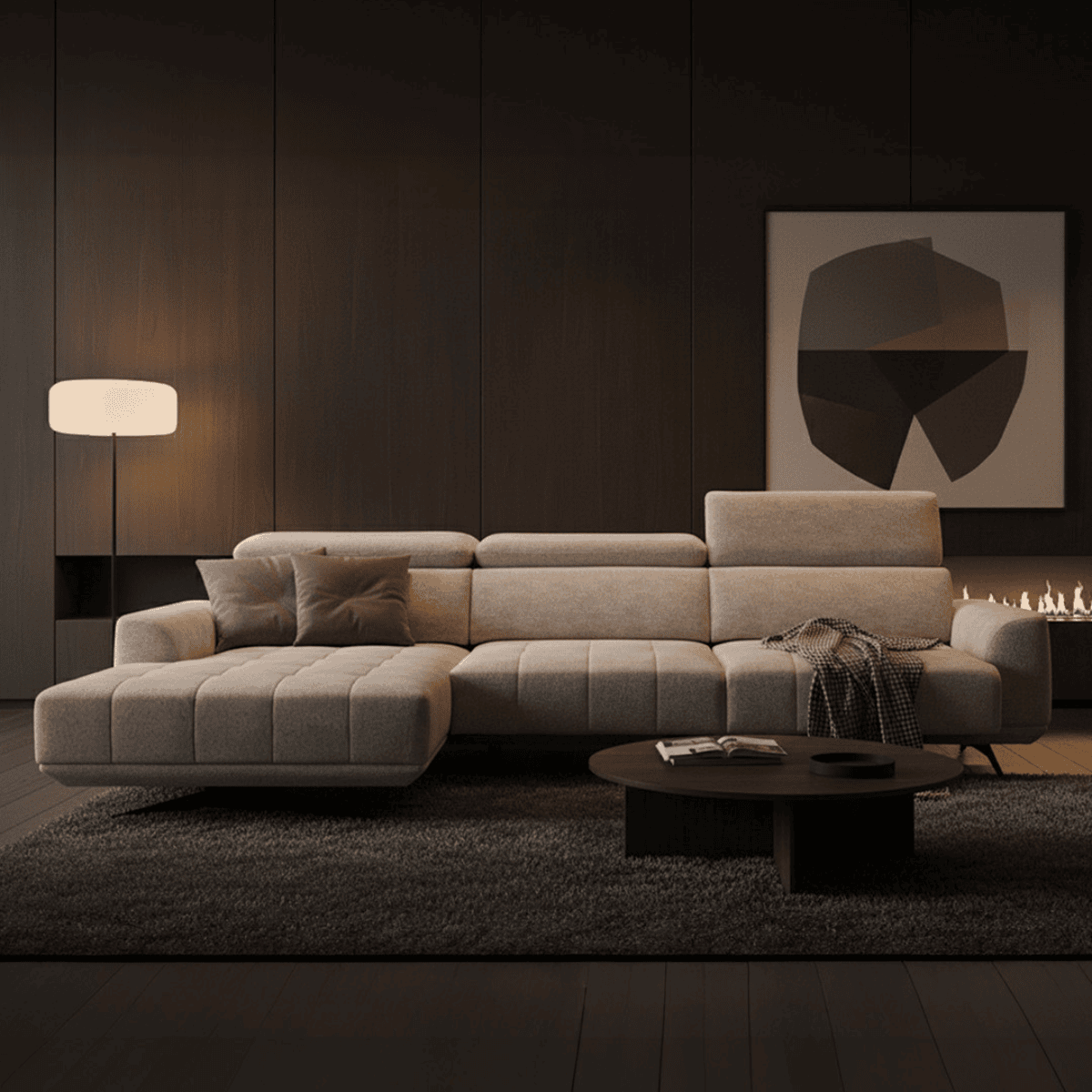 Najbardziej wyróżniającą cechą narożnika Eris jest zaawansowany system elektrycznego wysuwu siedziska, który pozwala na precyzyjne dostosowanie głębokości i pozycji wypoczynku do indywidualnych preferencji użytkownika. Dzięki temu innowacyjnemu rozwiązaniu możesz jednym przyciskiem zmienić standardową pozycję siedzącą na bardziej relaksującą, półleżącą, idealną do oglądania telewizji czy popołudniowej drzemki. Elektryczny mechanizm działa płynnie i cicho, zapewniając maksymalny komfort podczas regulacji.